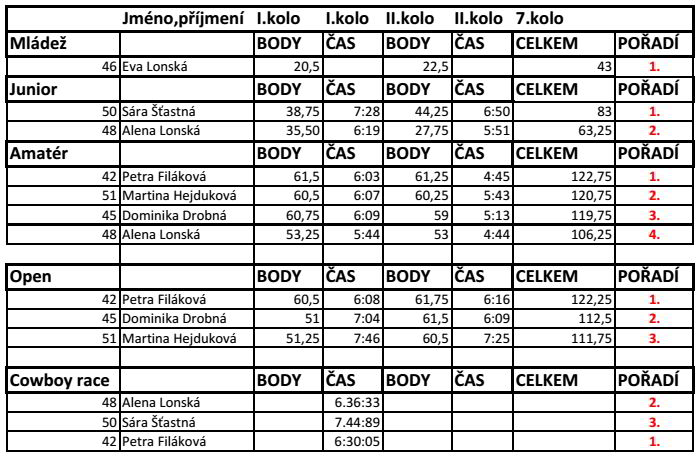 Mládež, Junioři, Amatéři, Stále mladí, Nováčci, Open a Extreme Cowboy Race Open.